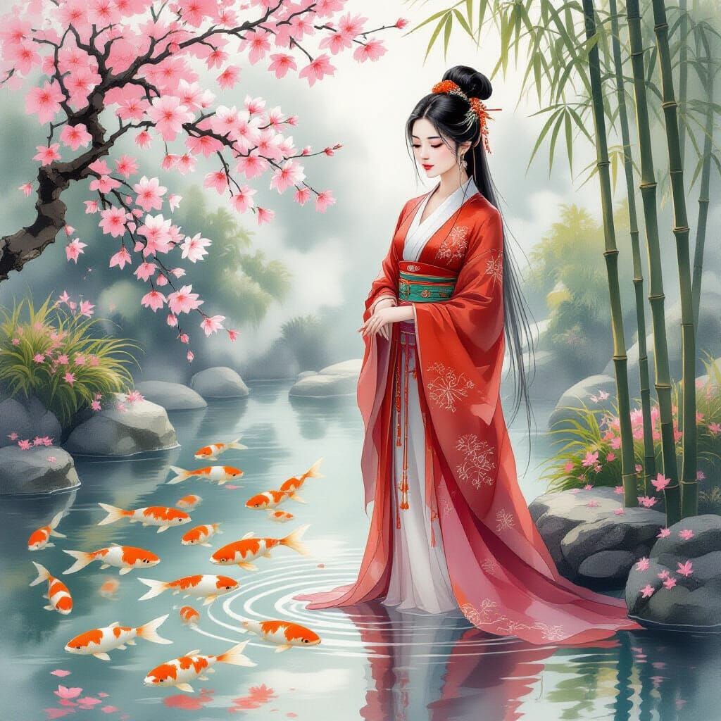 This image shows a peaceful Chinese woman in crimson silk robes beside a koi pond in an ancient, mist-covered bamboo garden with cherry blossoms. Rendered in a hyperrealistic watercolor style.