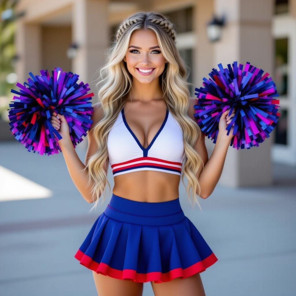 This image shows a blonde cheerleader with braided hair holding purple pompoms. She wears a white top with black accents and a short blue and red skirt.