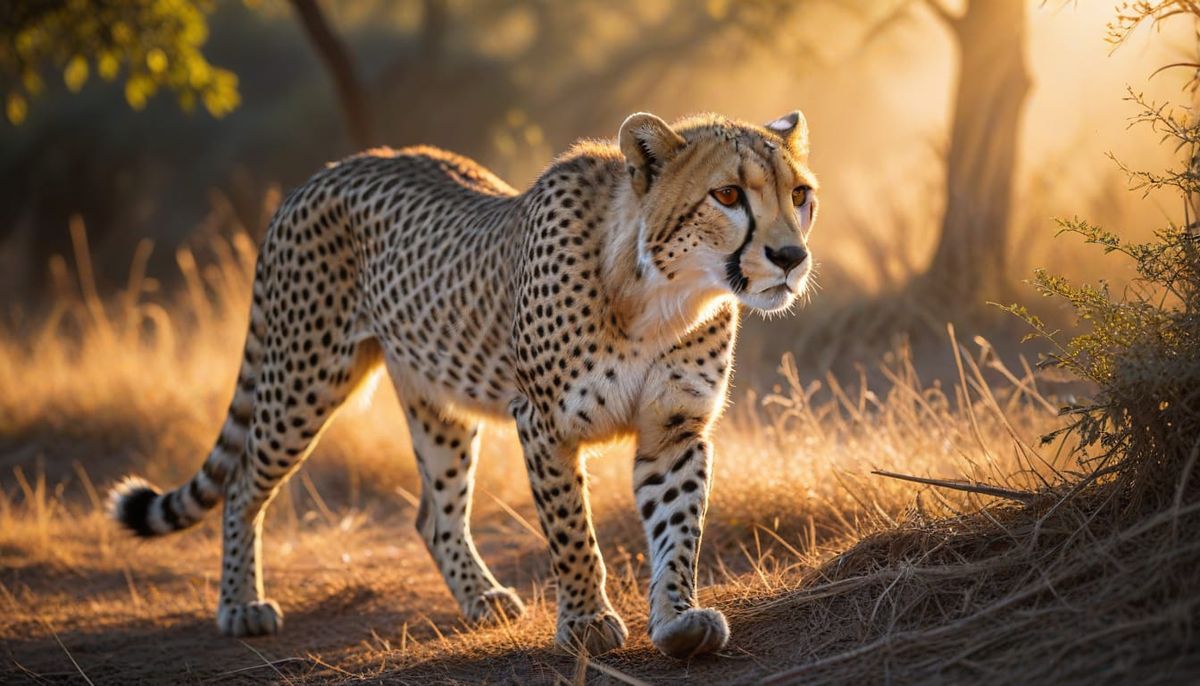 This image shows a cheetah chasing a horned deer through the African jungle. The photograph features a zoom effect, vibrant colors, high contrast, and warm lighting, reminiscent of golden hour.