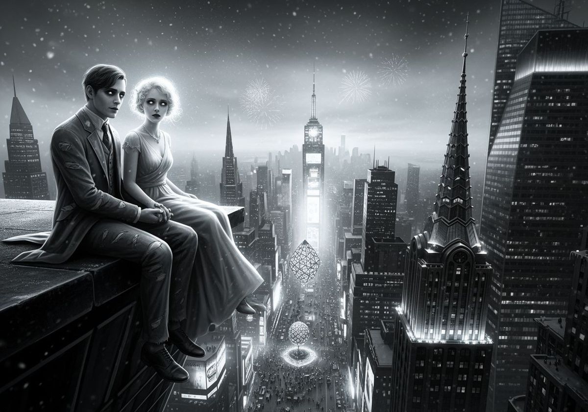 This image depicts a translucent couple on a skyscraper overlooking a gothic New York City on New Year's Eve, rendered in a vintage, black-and-white film style with subtle highlights.