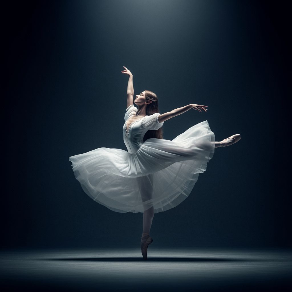 This image shows an elven ballerina in a dramatic pose, wearing a flowing tutu. The cinematic lighting and intense film grain give the picture an epic and atmospheric quality in a cinematic style.