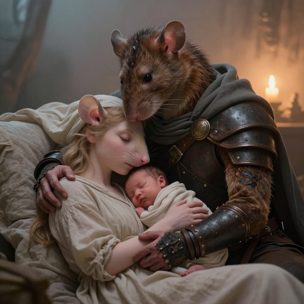 This image captures a heartwarming scene of an anthropomorphic mouse family, bathed in soft candlelight and dawn light. It evokes a sacred atmosphere of love and protection, rendered in a fantasy realism style.