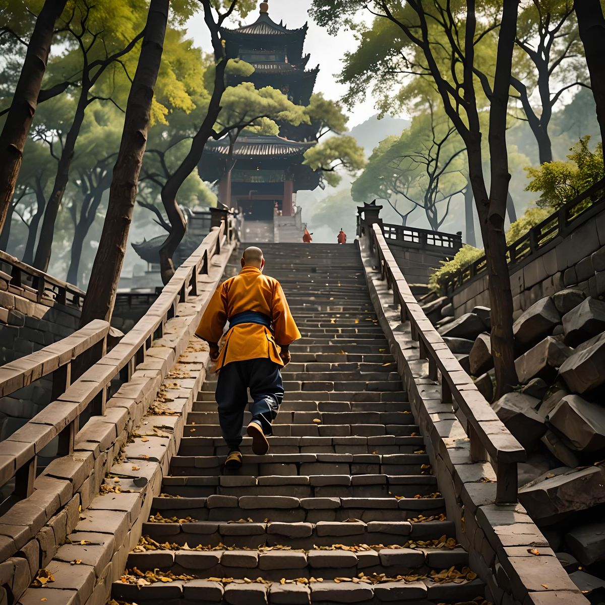 A photograph of a Shaolin samurai ascending a large ancient staircase leading to the Shaolin Wudan temple, set within an ancestral forest in China. Captured with professional photography techniques.