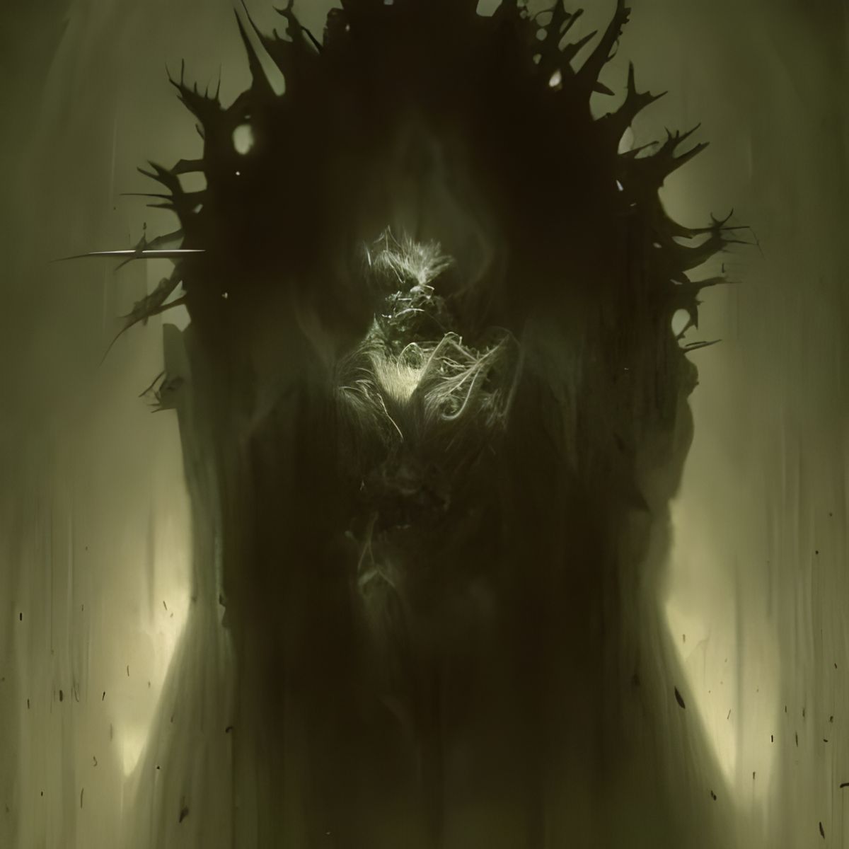 A haunting face looms from the darkness, reminiscent of gothic horror art. The dramatic lighting and intricate details evoke a sense of divine yet terrifying power.