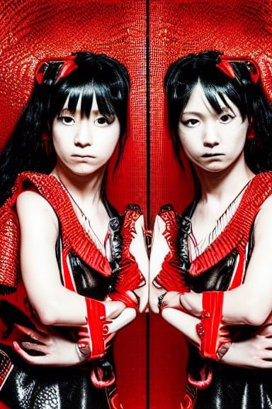 A vibrant close-up portrait of the Japanese heavy metal band BABYMETAL. The image features a shallow depth of field, professional studio lighting, and sharp focus.