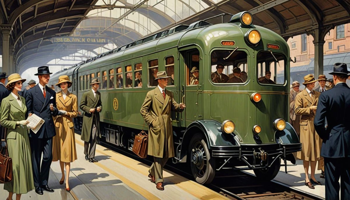 Concept art of a sleek, olive green train with balanced design at a station. Travelers gather around, evoking vintage charm and elegance in a classic illustration.