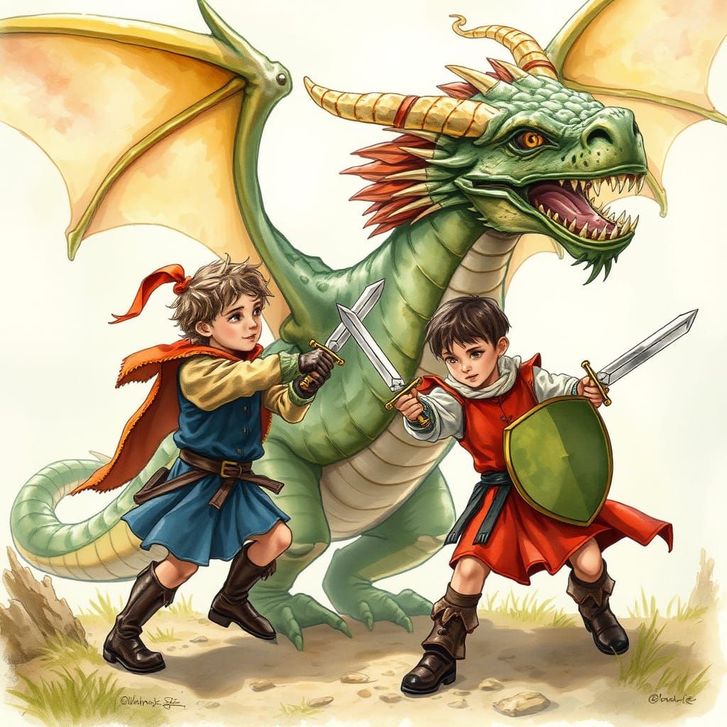 This enchanting image depicts a group of little boys in medieval costumes, armed with toy swords and shields, as they engage in a fantastical battle with a semi-transparent dragon. The scene is reminiscent of classic children's book illustrations, with intricate details and textures that bring the whimsi...