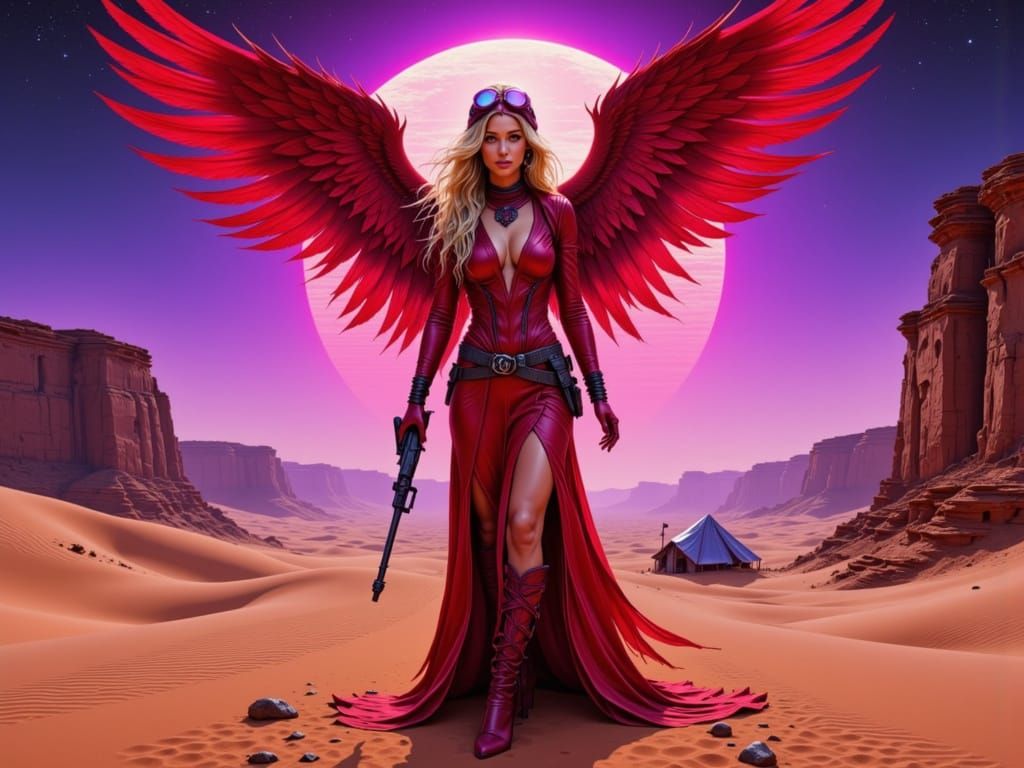 This image shows a Featherborn female warrior in a desert landscape at dusk, rendered in a sketch art style. She wears a scarlet outfit with unique wings and carries futuristic weaponry.