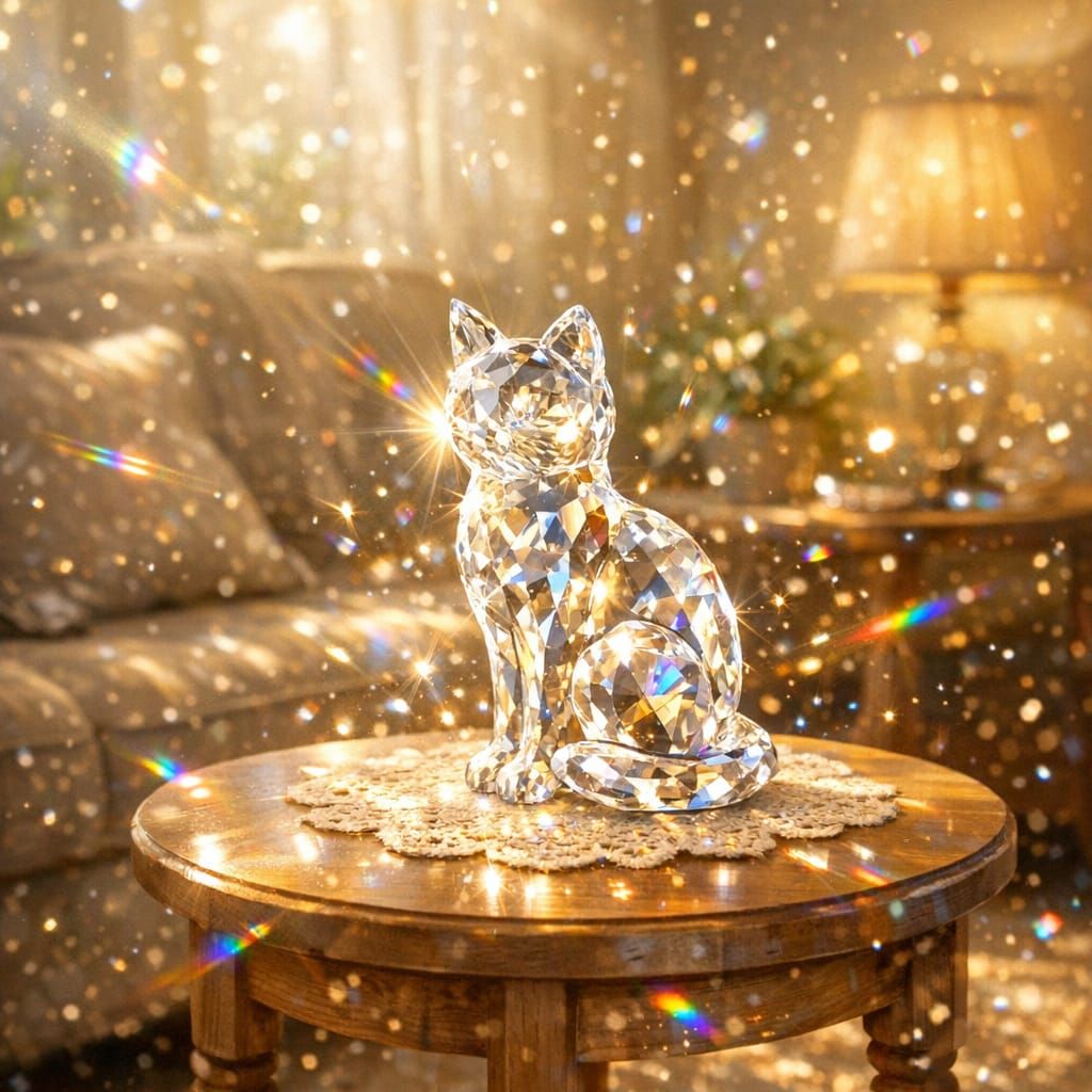 This image features a diamond-like crystal cat figurine on a small table, bathed in sunlight. The light creates shimmering reflections and colorful glimmers throughout the cozy room, evoking a magical, dreamy atmosphere.