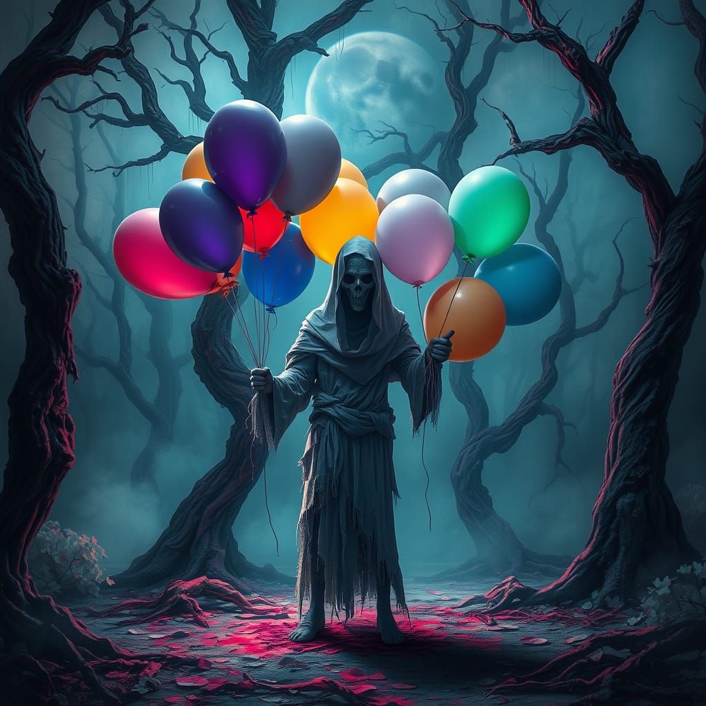 This image shows a spectral figure in ragged clothes holding colorful balloons in a haunted forest. Eerie mist swirls around twisted trees in this ominous scene with dramatic lighting, in Rutkowski-style.