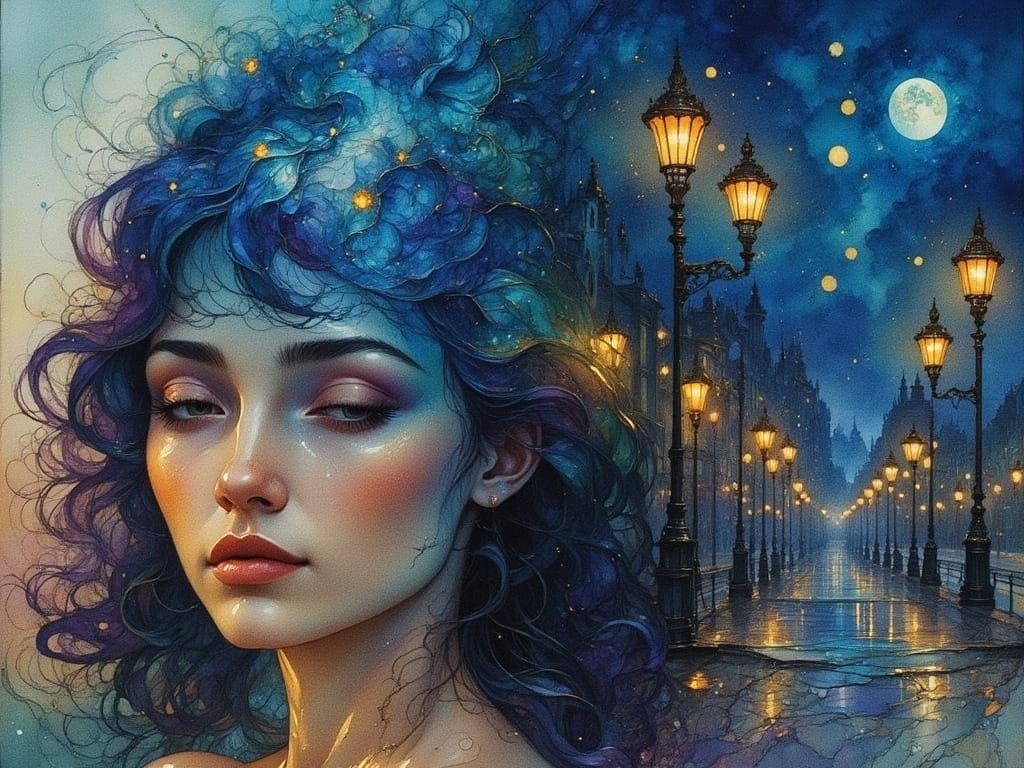 This image depicts a surreal woman with eyes closed, bathed in soft light on a shimmering night street. Dreamlike imagery surrounds her, rendered in an expressionist oil and watercolor style with cinematic lighting and rich colors.