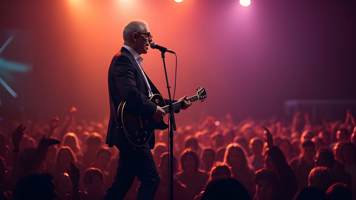 This image captures a classic rock scene, a solo performer in his 50s, surrounded by cheering fans, exuding a nostalgic 80s vibe with his suit, aviator glasses, and shaved head.