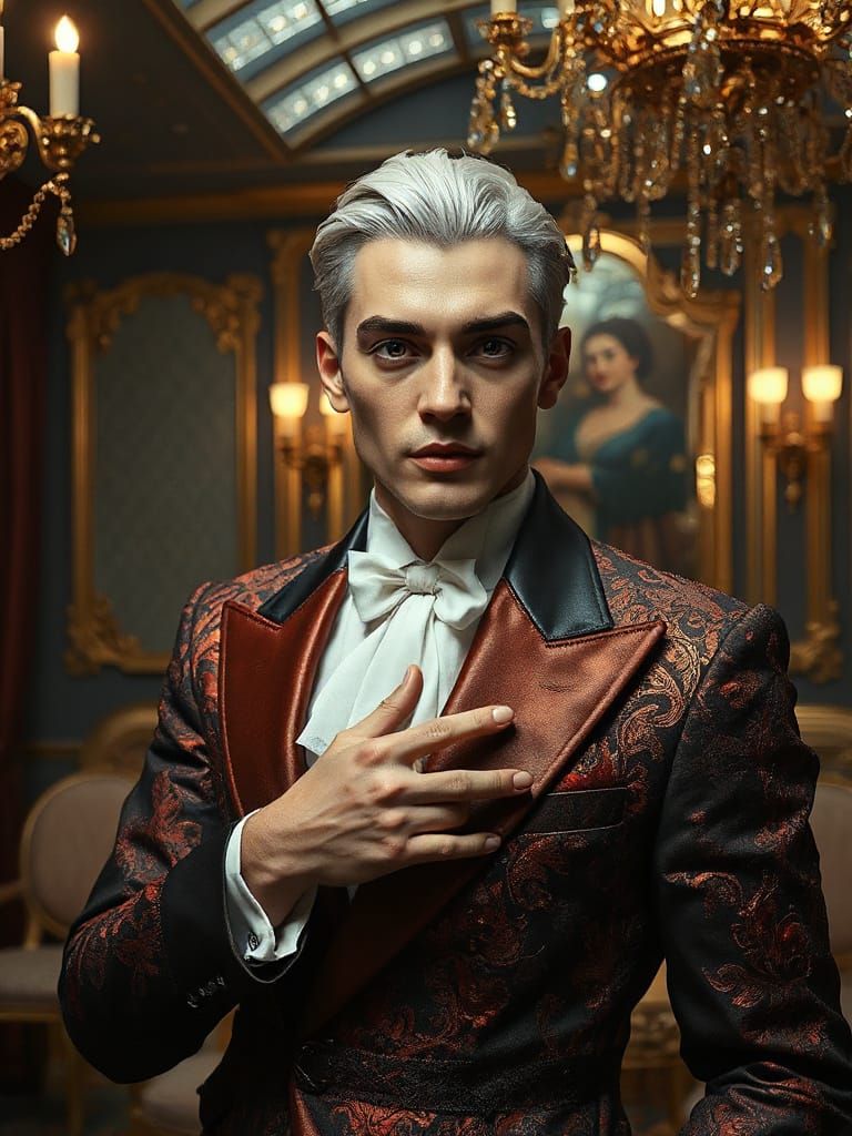 This image shows a stunning 3D supermodel in extravagant attire, posing in an opulent setting. The aesthetic is inspired by avant-garde art with dramatic lighting and volumetric textures, rendered as cinematic fashion photography.