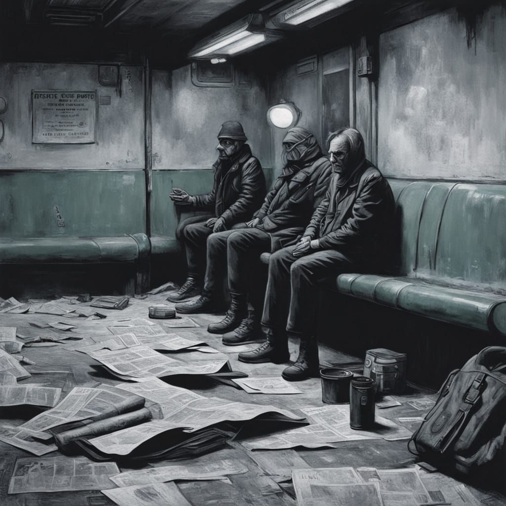 This image shows a black and white photograph of a crowded, run-down subway station filled with people in tattered clothing. The gritty, high-contrast picture evokes a film noir aesthetic.