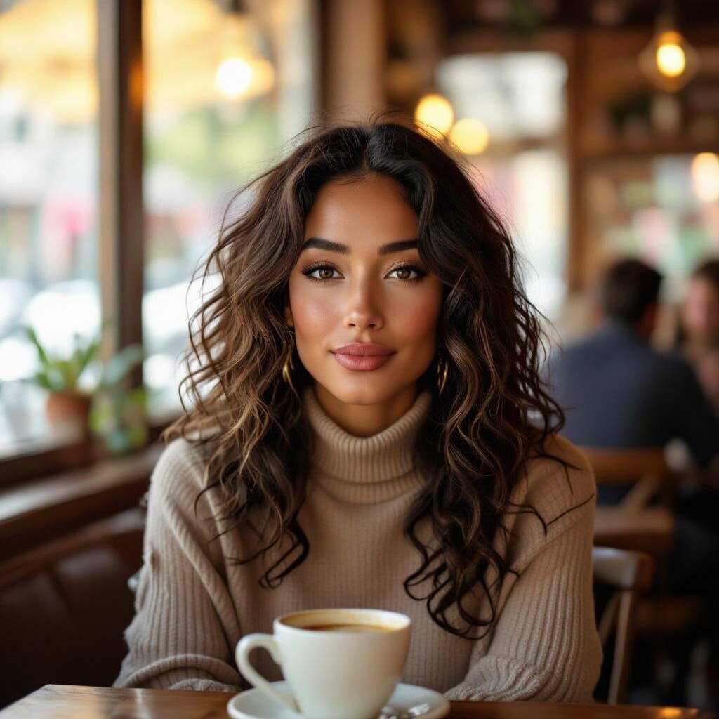 This photorealistic image shows a woman with warm skin and curly hair sitting in a cozy cafe. Soft, cinematic golden hour light creates an inviting atmosphere, captured with a shallow depth of field.