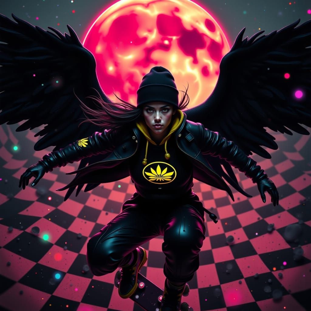 A dynamic shot of a female skateboarder mid-air against a checkered backdrop. She wears a beanie, with wind-swept hair and neon yellow accents. The image has a retro aesthetic.