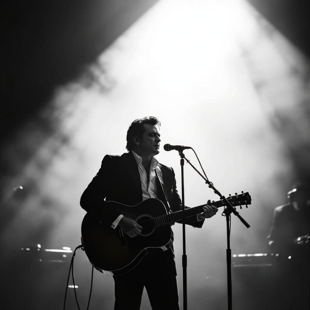This image captures the iconic silhouette of Johnny Cash performing under a spotlight, emphasizing deep shadows and high contrast in a stark, black and white photographic style.