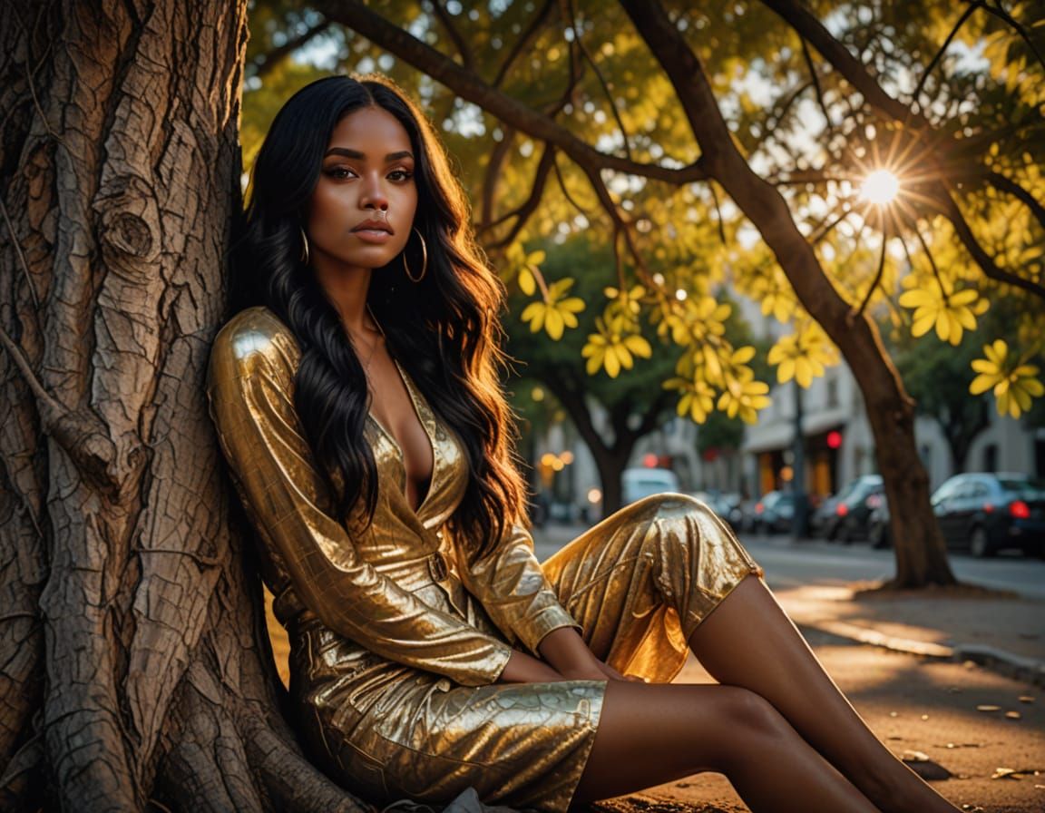 This image shows a 22-year-old Dominican woman with long black hair and gray eyes sitting by a tree. The digital art features vibrant colors, dramatic lighting, and a hyper-stylized, glamorous aesthetic.