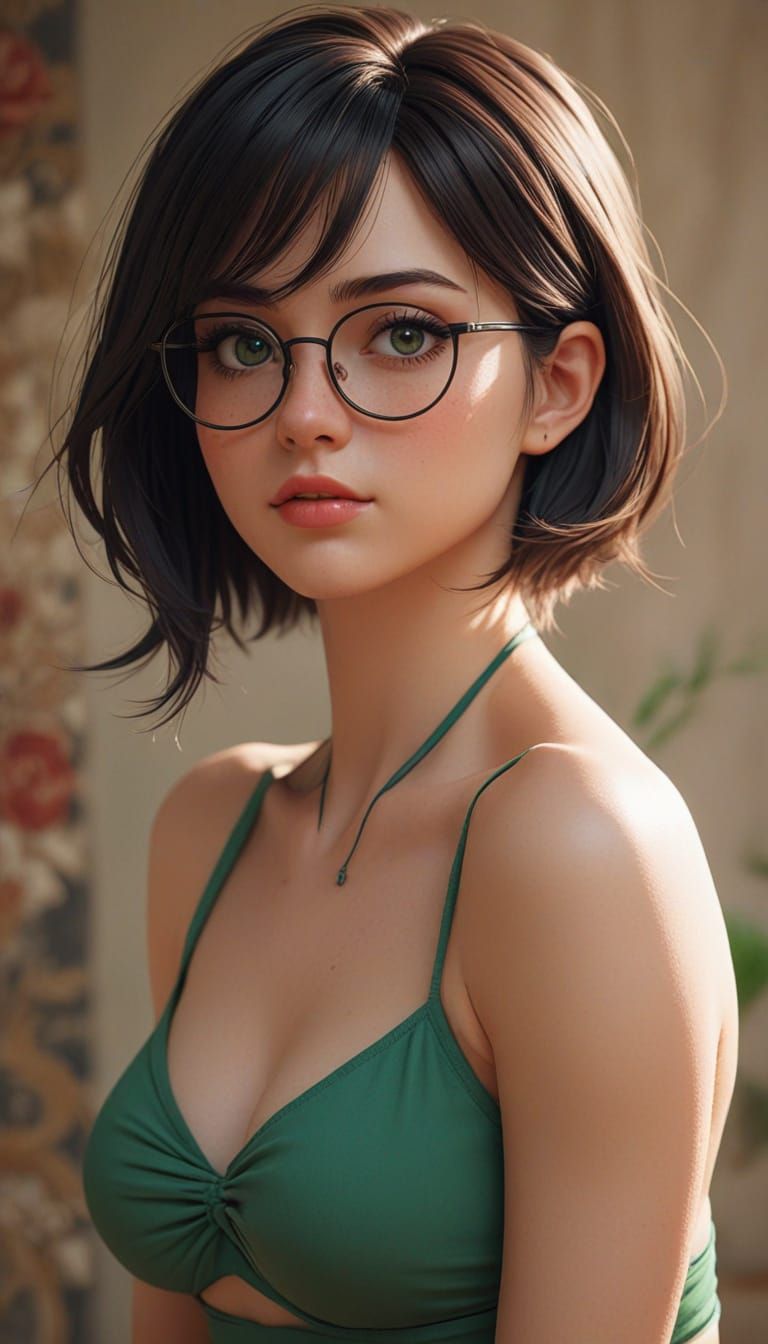 2D anime illustration, Anime v2 style, clean bold lineart, cel shaded. Adult Katerina Heiss, pale porcelain skin, emerald green eyes, sleek black glasses, voluptuous hourglass figure. String bikini. Seated close with knees apart, one hand at cheek, the other on thigh, tender guarded look with a tiny ...