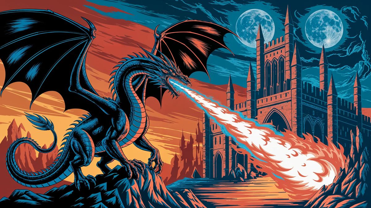 This image shows a powerful dragon in mid-battle, its black wings outstretched as it breathes fire on a gothic castle. The scene is bathed in the soft light of two moons, creating a dramatic and captivating fantasy landscape.