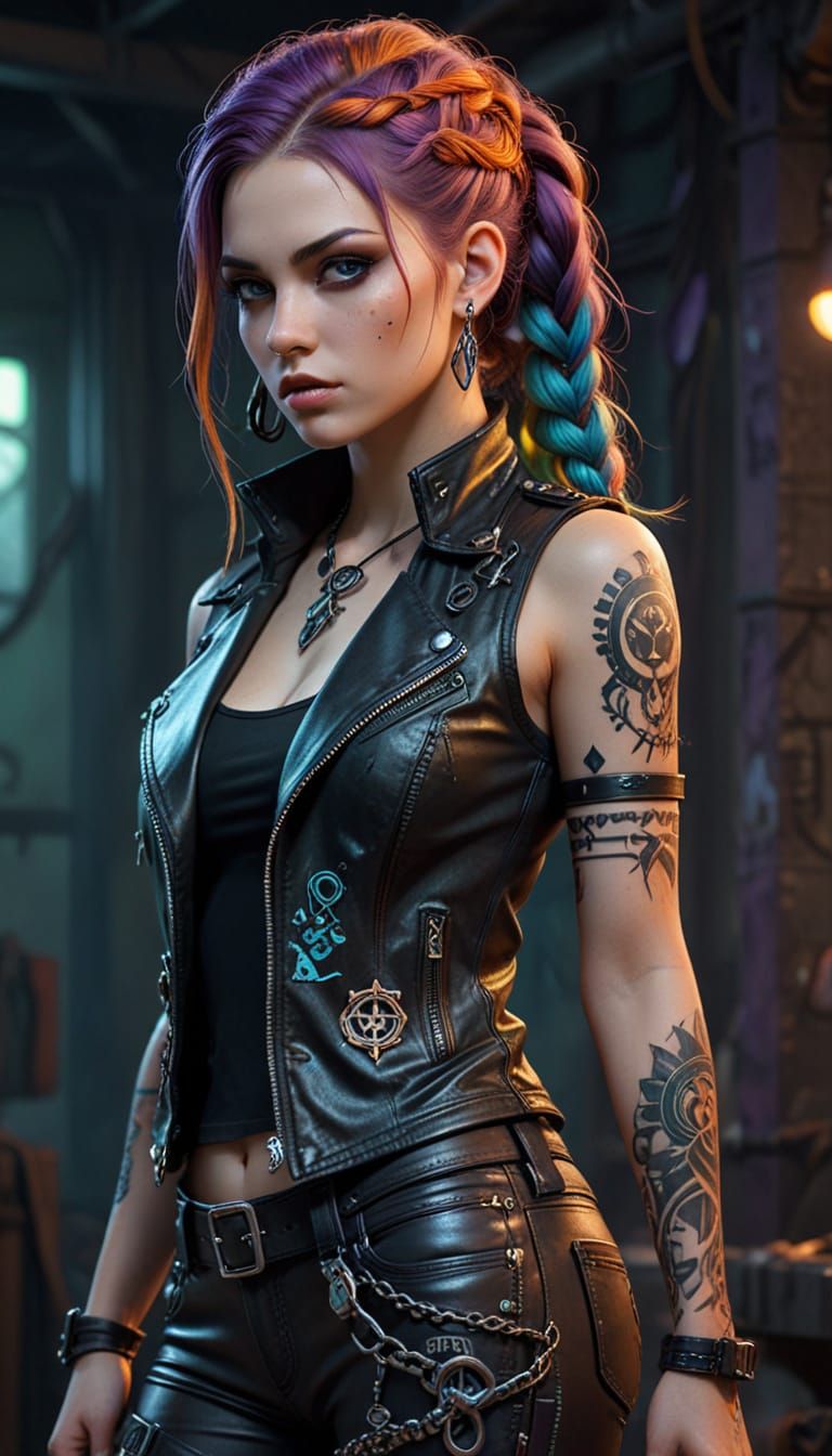 This image shows a fantasy-punk girl with vibrant, multicolored braids. She is depicted in dark fantasy art style, with gothic tattoo details, metallic piercings and a post-apocalyptic aesthetic.