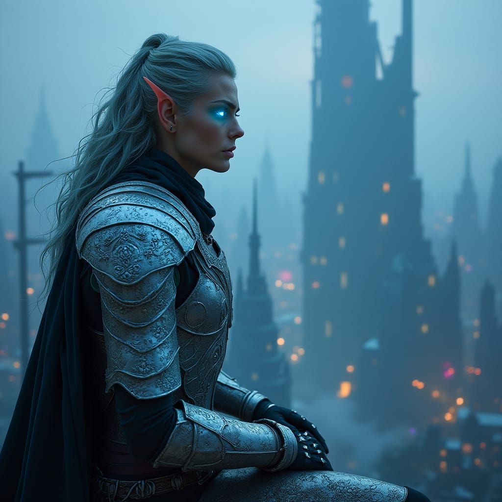An elven warrior in silver armor gazes over a vast, neon-lit futuristic city. The scene blends fantasy and sci-fi realism with a synthwave aesthetic.