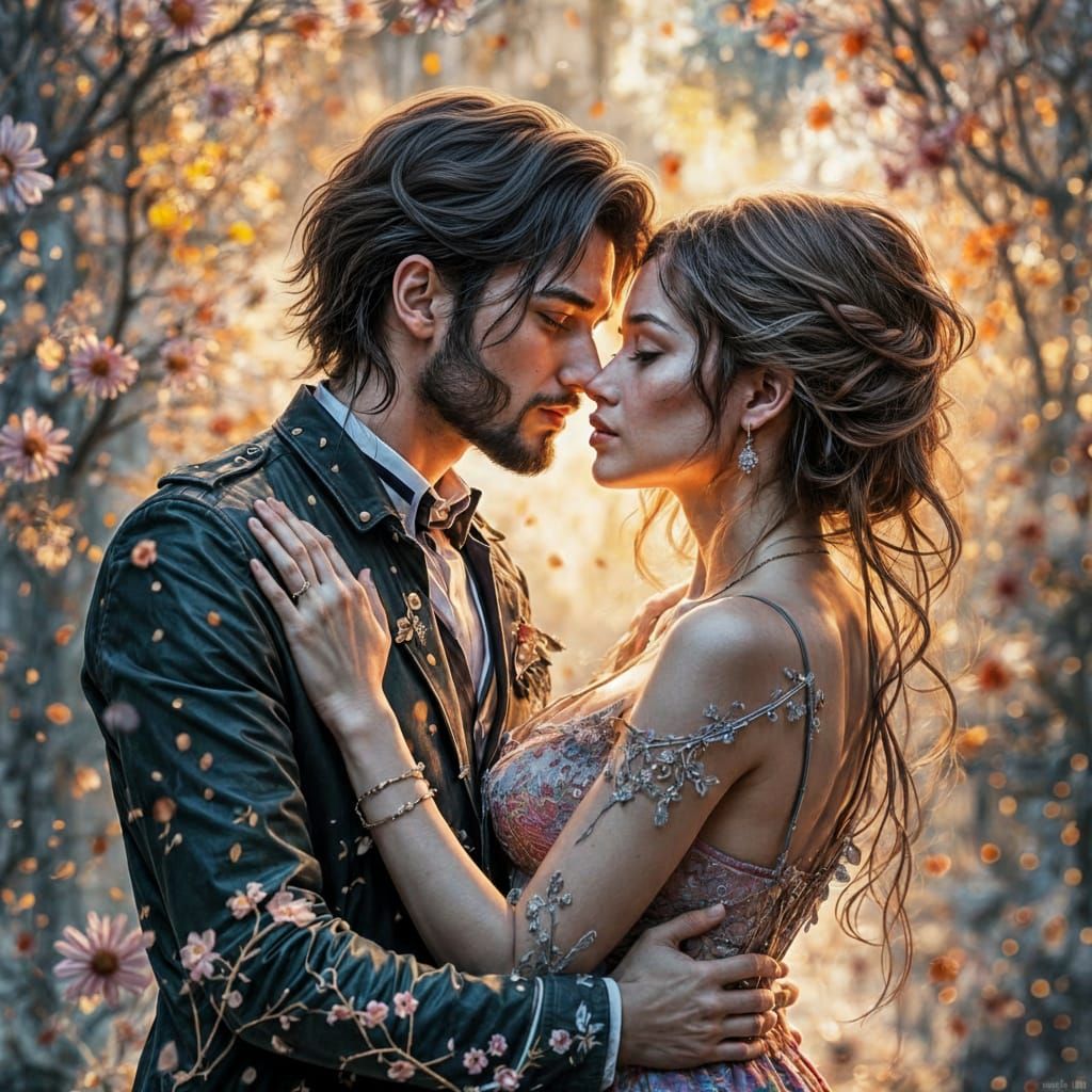 This image shows a beautiful couple embracing on the London Bridge, moments before a kiss. The scene is rendered in a hyperrealistic watercolor style with a colorful, splash art background.
