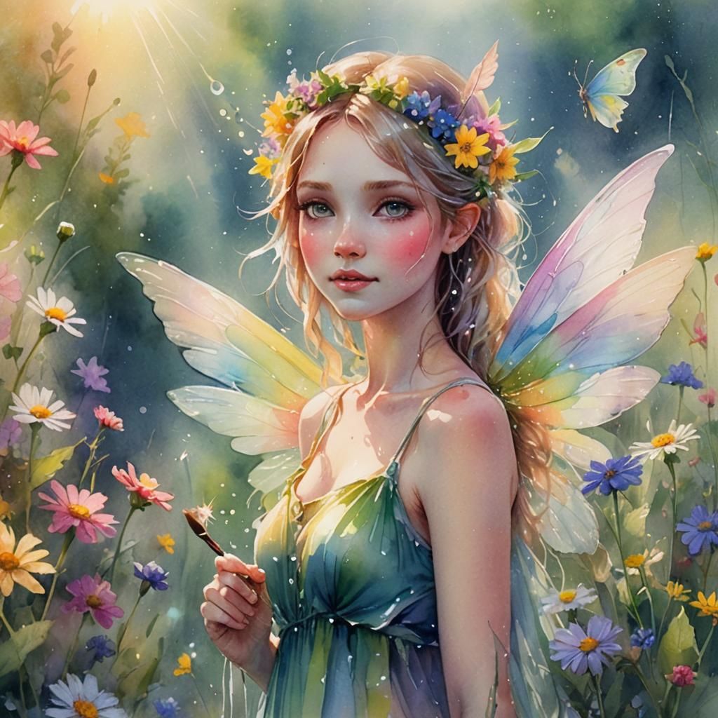 A vibrant watercolor image shows a fairy holding a rainbow brush, surrounded by wildflowers in sunshine. The artwork uses expressive brushstrokes and pastel hues to create a dreamy, ethereal glow.