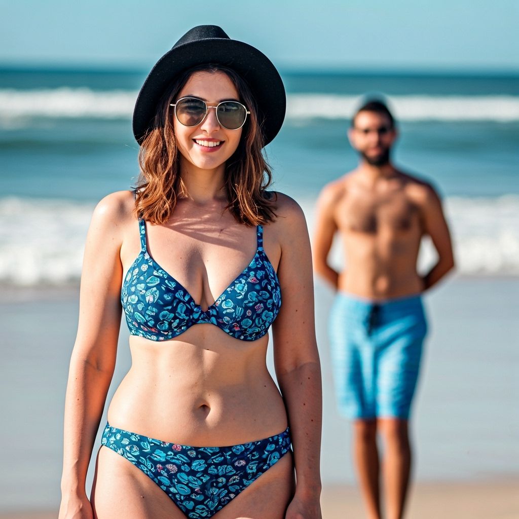 This image shows a modest Haredi woman in swimwear at the beach. A handsome Haredi man is in the background. The image is reminiscent of professional photography with sharp focus and natural lighting.