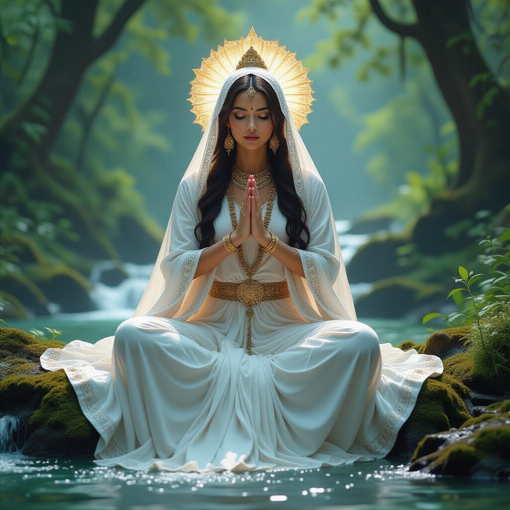 This image shows a levitating prophetess in prayer, adorned in an archaic dress with Indian patterns. She sits above a torrent in a forest, rendered with romanticism and meticulous detail in a surreal style.
