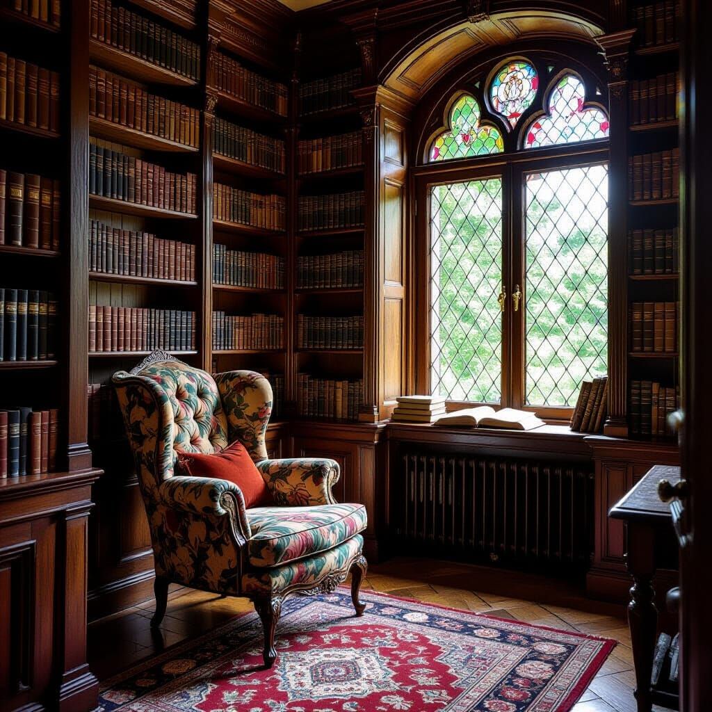 A striking picture of a cozy reading nook inside an antique library hidden within an enchanted forest. Emerald and sapphire light illuminate dust motes dancing in the air, in a hyperrealistic style.