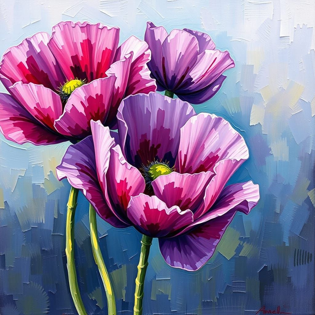 A textured oil painting shows purple poppies fading. This colorful fine art piece uses intricate details and wet-on-wet techniques, reminiscent of Impressionism.