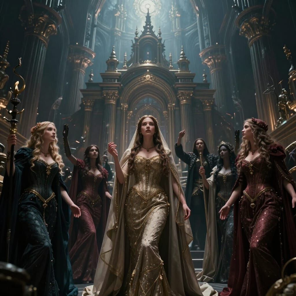 This digital matte painting depicts Keaton's dramatic triumph over the sisters of faith with intricate detail, atmospheric lighting, and a rich color palette, evoking a grand, cinematic narrative.