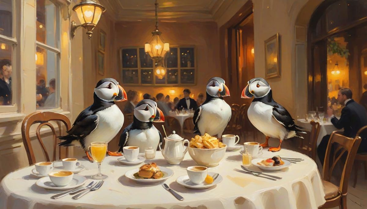 A charming image of puffins working as waiters in a French cafe, rendered with warm colors and soft brushstrokes. The scene evokes a cozy, golden-lit atmosphere in an impressionistic style.