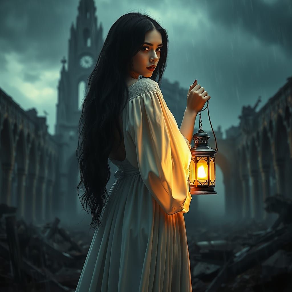 A hauntingly beautiful portrait of a woman in a flowing white dress, gazing enigmatically into the distance, surrounded by the ruins of a cathedral, with an eerie glow from a lantern casting deep, twisting shadows in the style of dark, mystical art