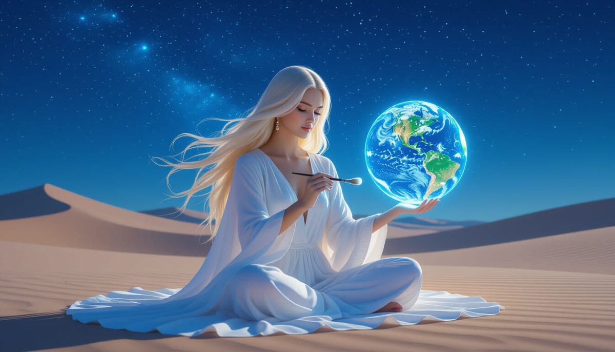 A dreamy image of a woman in a desert at night, holding a translucent globe. She paints luminous colors onto it in a hyperrealistic style, with blurred beige dunes in the background.