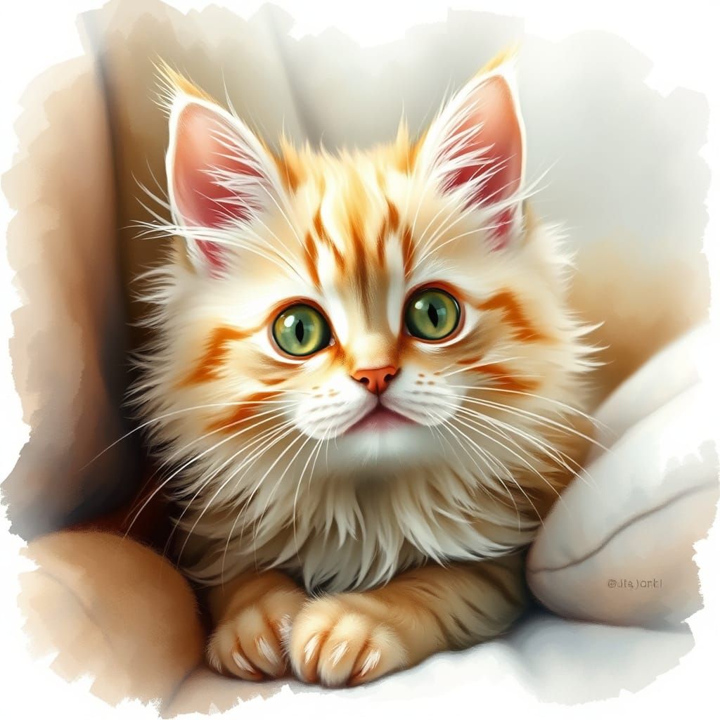 This image shows an adorable cat with fluffy fur and bright eyes, rendered in a soft watercolor style with a cozy, inviting atmosphere.