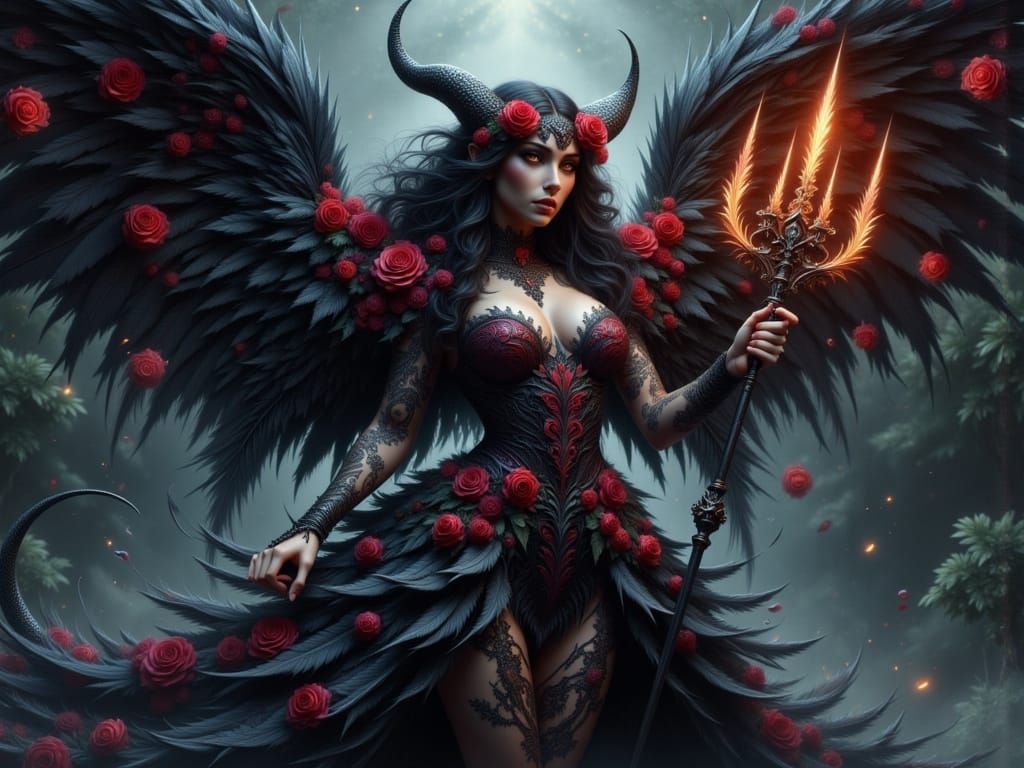 A striking picture of a dark angel demon in a triumphant pose. She wields a three-pronged fork, with black feather wings, horns, and a serpentine tail, in a dark fantasy style.