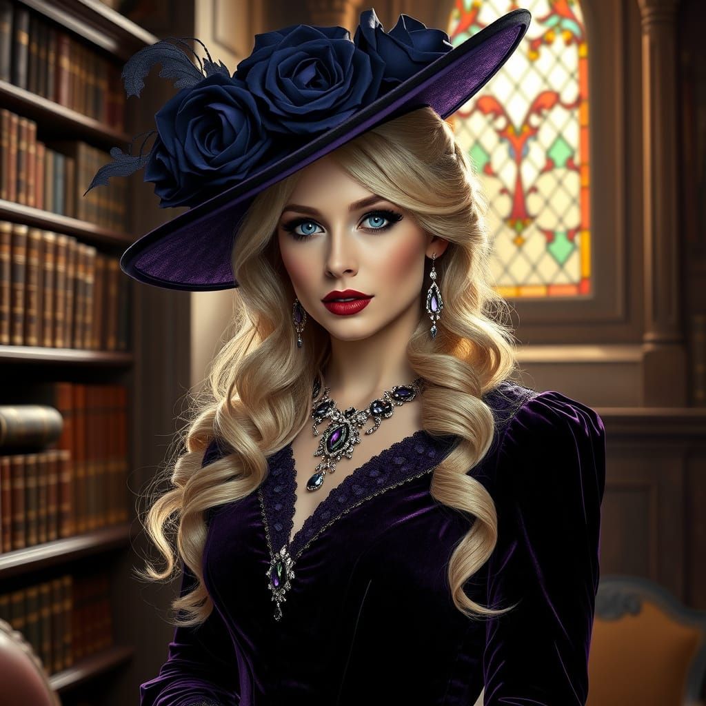 A dramatic, fine art portrait of a regal caucasic woman with blond hair and blue eyes. She is elegantly posed within a softly focused, antique library setting. The woman is dressed in a luxurious Victorian Gothic gown of deep velvet, intricately embroidered with sparkling amethyst and onyx gemstones. ...