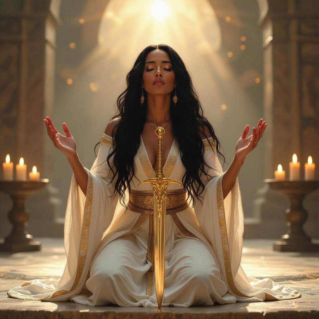 A striking picture of a Black woman in prayer at an altar. Bathed in divine light, she wears robes of white and gold, holding a sword. The image is rendered with hyperrealism and dramatic lighting.