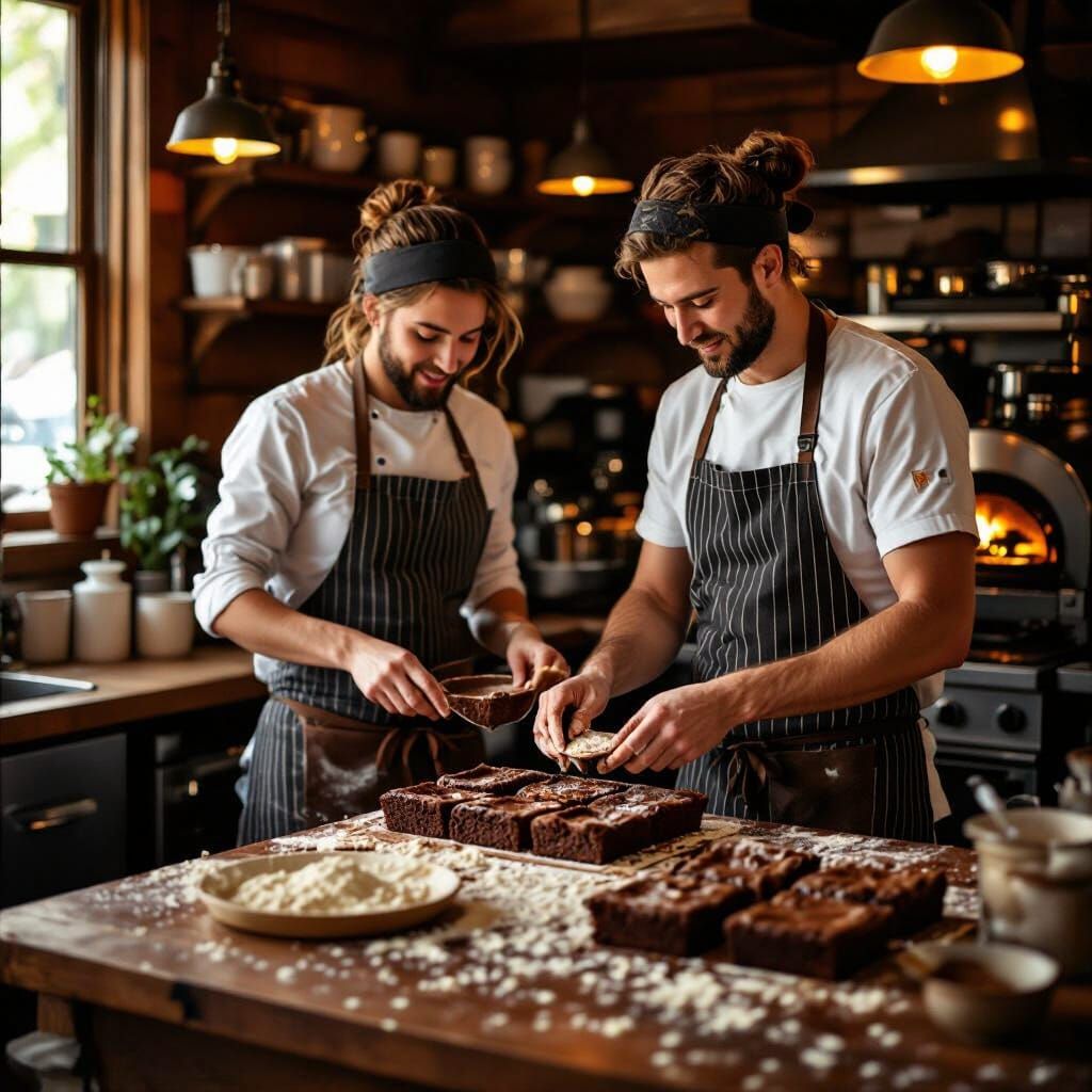 This image shows baristas baking brownies in a cozy coffee shop kitchen, bathed in warm, golden light. It evokes an oil painting style with rich lighting and textured details, suggesting artisanal dedication.