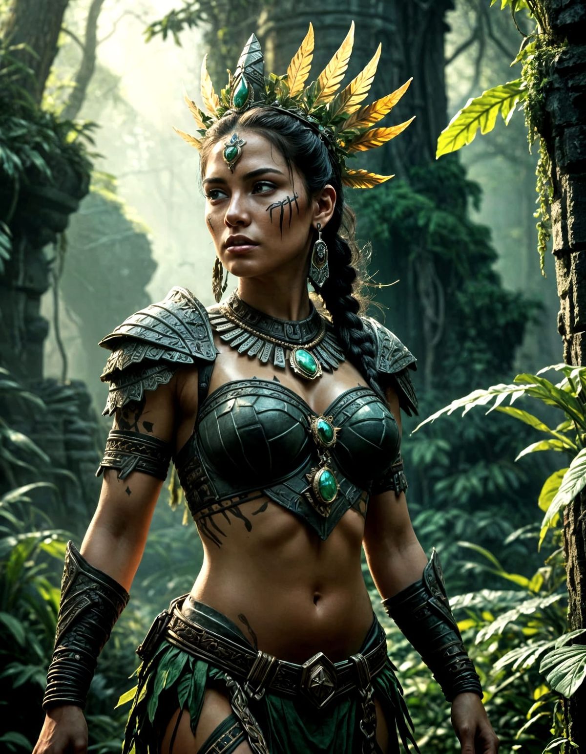 in a intimidating hero pose , A formidable tribal queen, adorned with tribal breast plate intricate jewelry and battle scars, stands atop a towering ziggurat in the heart of a lush, primordial jungle. Sunlight filters through the dense canopy, casting dappled shadows on her muscular physique. her expression ...
