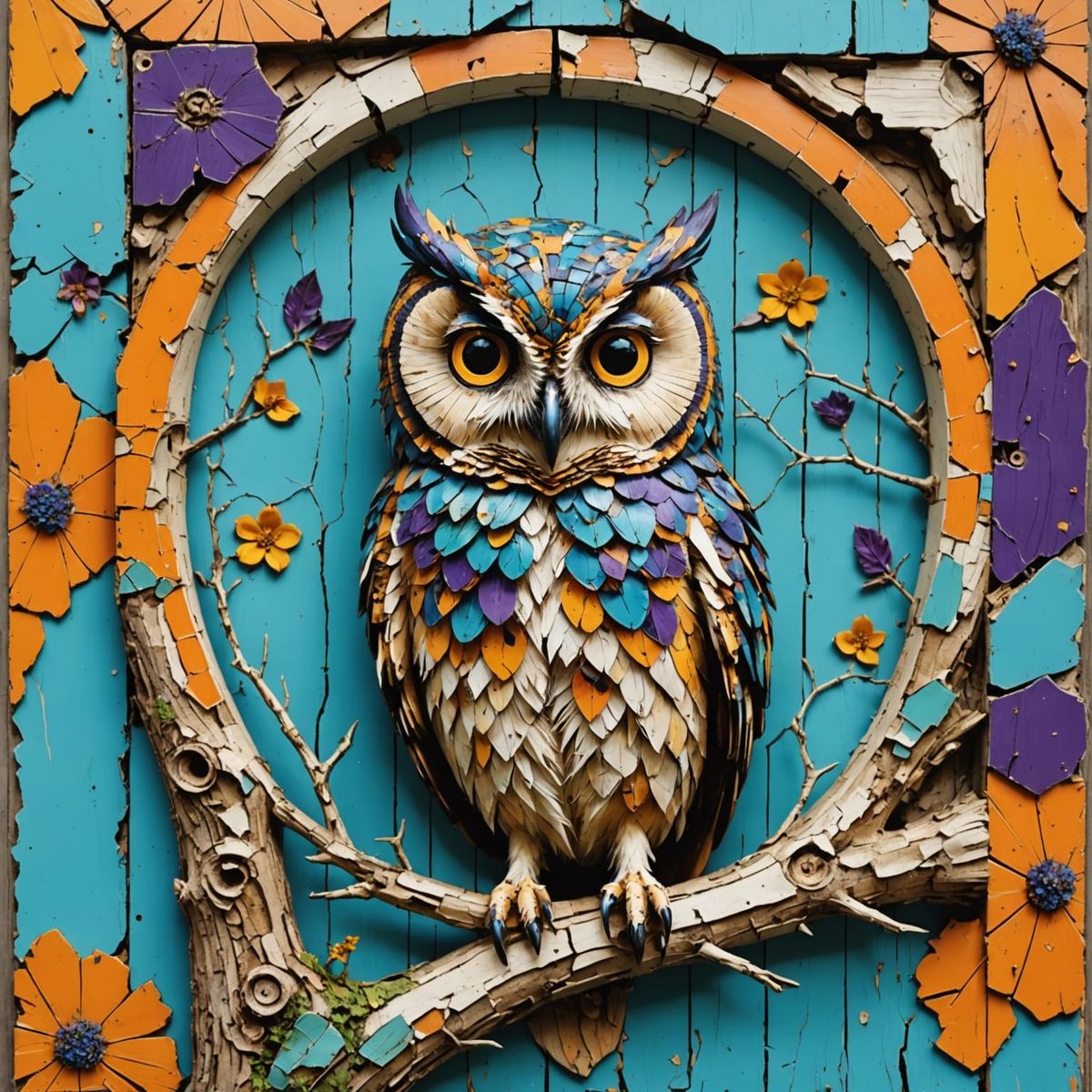 This image shows an owl perched on a tree in a surreal, textured artwork. The piece features peeling plaster, vibrant colors, and elements of urban decay blended with whimsical surrealism.