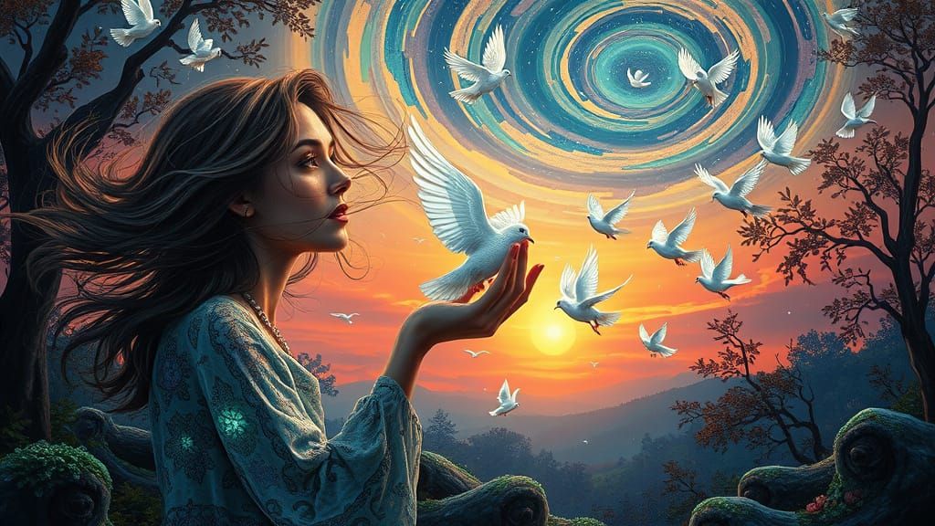 A surreal landscape blending sacred geometry, psychedelic art, and cosmic elements. This maximalist image depicts a serene woman offering sustenance to doves amidst an ethereal, dreamlike setting with an iridescent, shimmering aura.