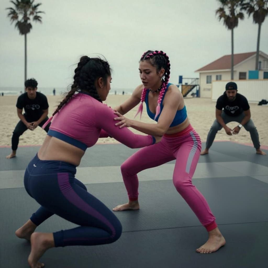 This image captures a dynamic grappling workout class on Venice Beach, featuring a punk woman with braided hair. Presented as a cinematic film still with atmospheric lighting and film grain.