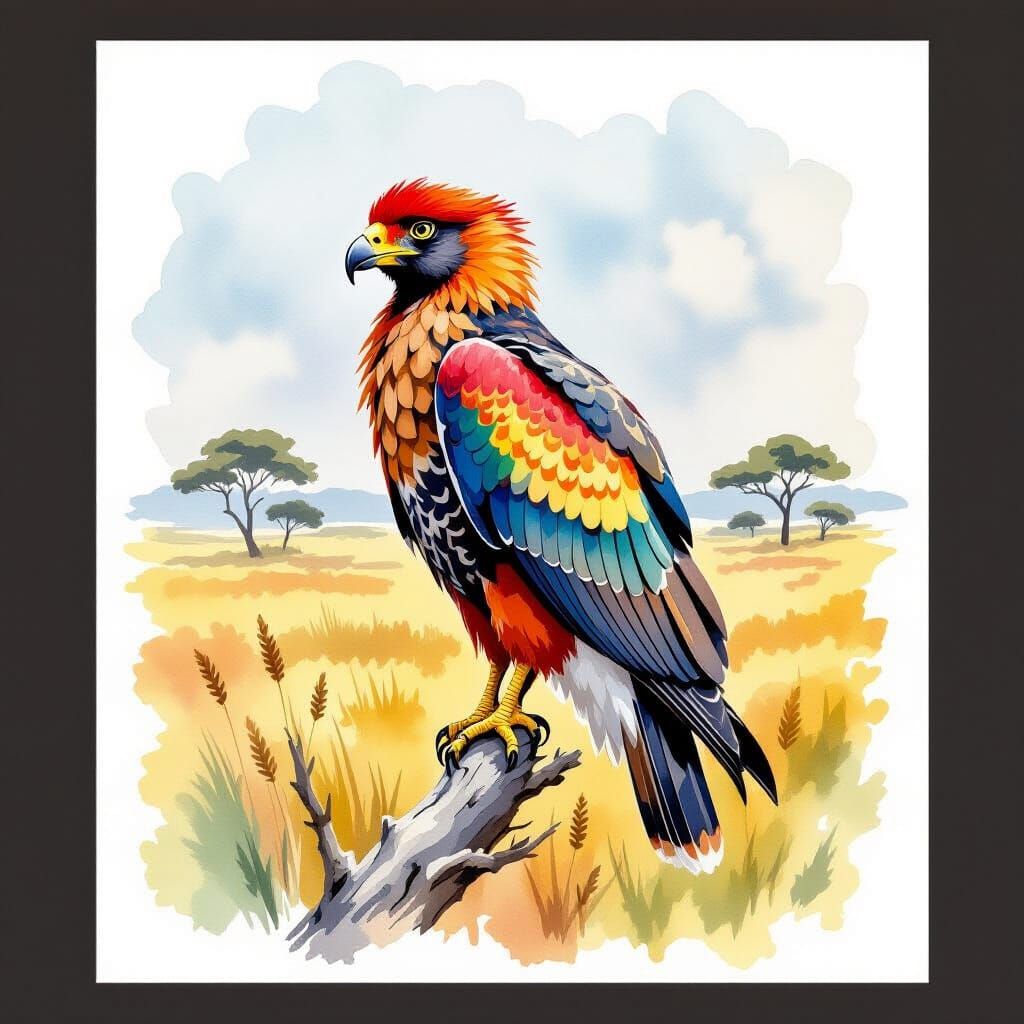 This image showcases a realistic watercolor painting of a Bateleur eagle perched in its natural savanna habitat. The artwork captures the bird's vibrant plumage and the expansive African landscape.