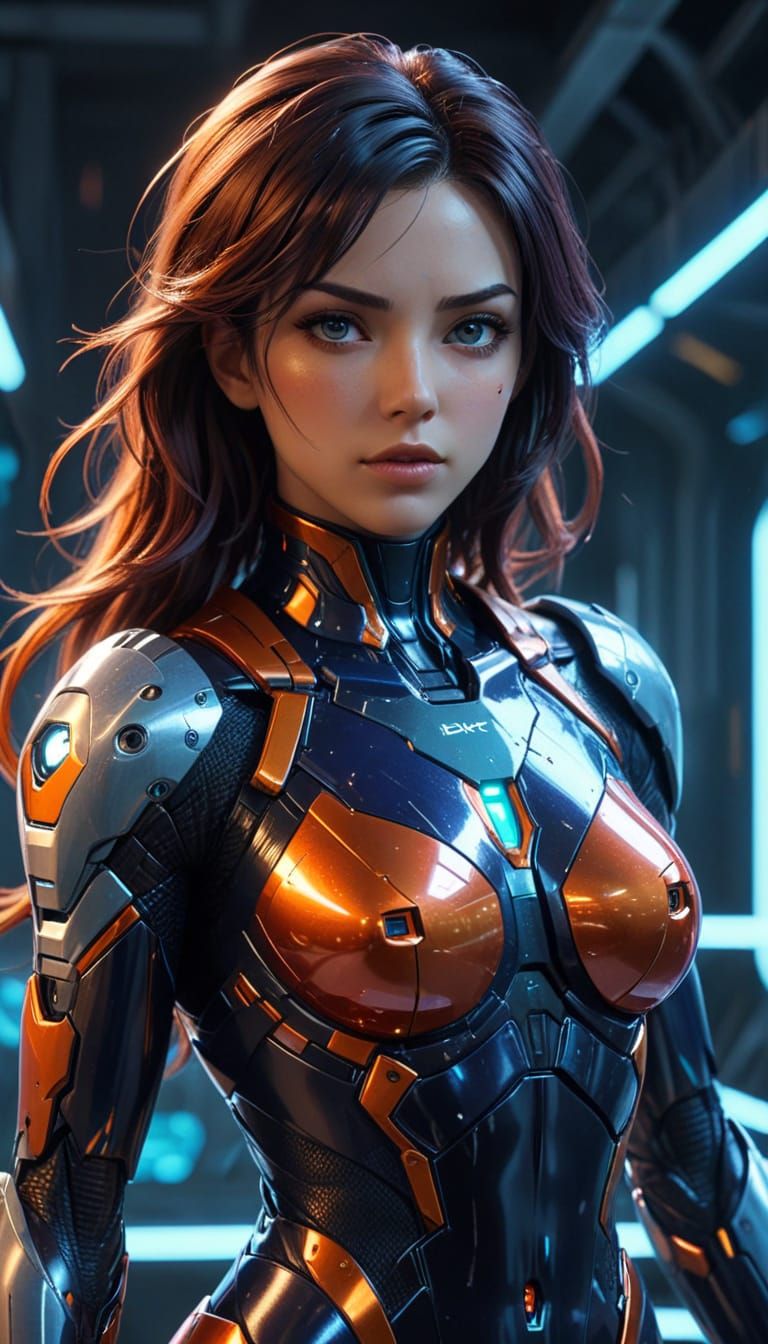 This anime-style image shows a beautiful woman in a form-fitting suit, captured in a state of stasis. Features enchanting eyes, vibrant colors, and dynamic lighting in high definition.