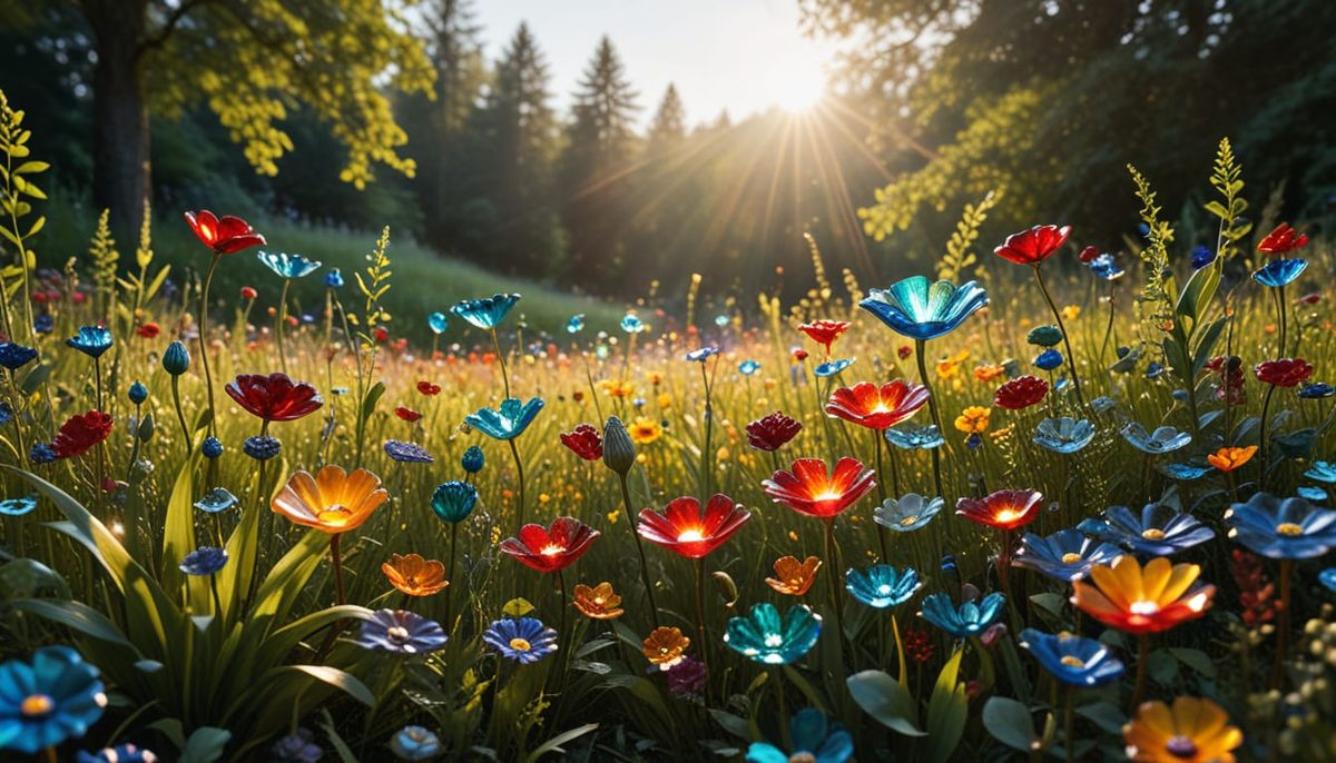This image captures a serene meadow scene where glass flowers refract sunlight, casting shimmering patterns. A fusion of natural beauty and glasswork artistry creates a surreal landscape.
