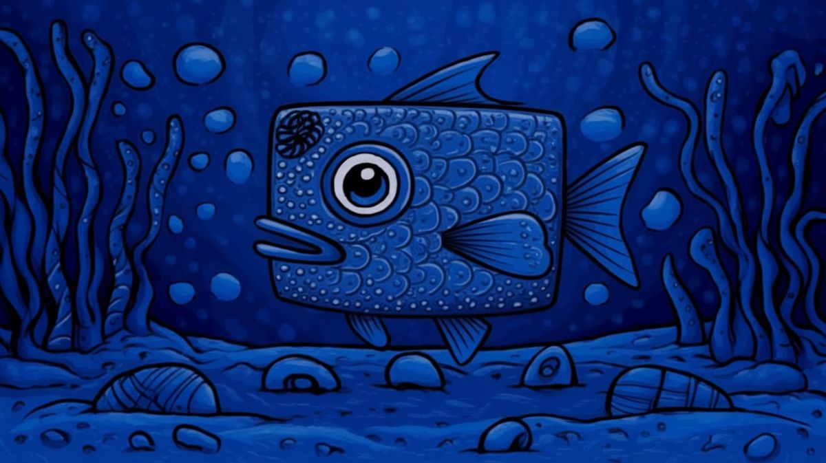 This image showcases a square blue fish swimming in an all-blue ocean, featuring blue sand, pebbles, and kelp, rendered in a surreal, cartoony doodle style.
