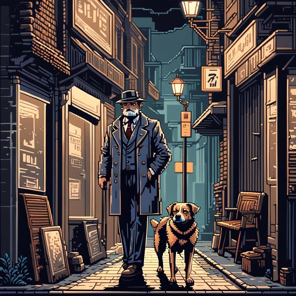 This image shows a pixel art scene of an elderly detective and his dog in a dimly lit back alley at night. The 8-bit style gives the scene a retro vibe.